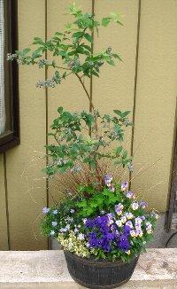 パンジー、ビオラ、ブルーベリー、オダマキ、斑入りブルーデージー、ブラウングラス・ブキャナリーの寄せ植え