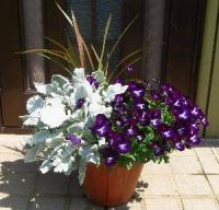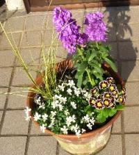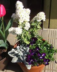 パンジー「虹色すみれ」、白のストック、大葉シロタエギクの寄せ植え