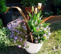 植えてから一ヶ月後、紫の花はストックで細長の葉は「カレックス・ジェネキー」。