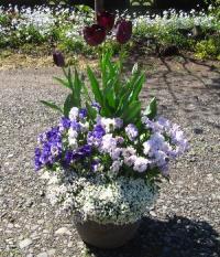 フリル咲きミルフル 「ブルーフリル」と「ピンクフリル」とスイートアリッサムの花であふれています。葉ものが入るとよかったですね・・・後方の白い花はハナニラです。
