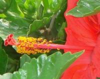 ハイビスカスは広漏斗状の大きな五弁花で、雌しべが長く突き出ています。