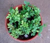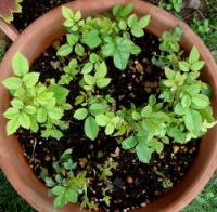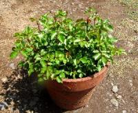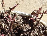 ミニバラの芽が出る。軒下に置いたので畑のミニバラより芽吹きが早い。