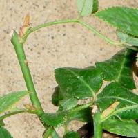 これは昨年の畑のバラで、チュウレンバチが枝に差し込んで卵をうみつけているところ