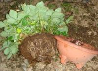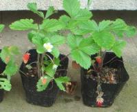 イチゴ類は肥料に弱いので、肥料分が少ない培養土で排水がよくなるように植え替えます。