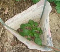 まだ強風や遅霜、雨の降る日、気温が低い日があるので、底部分もカットした肥料の空き袋を利用し、苗を保護すると安心です。