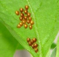 ピーマンの葉の裏にホオズキカメムシの卵。黄褐色の卵を数粒†数十粒の塊で産卵する。