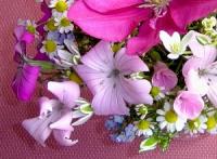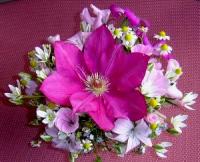 クレマチスの花を中央にしてワスレナグサやカモミールと。