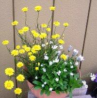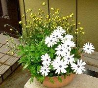寄せ植えのヘリクリサム・ペーパーデージー、ワスレナグサ、オステオステルマム