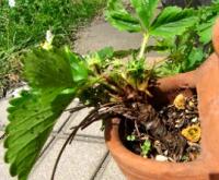 冬にストローベリ†ポットの用土が少なくなったので、上から自前のぼかし肥料を入れておきました。親株からランナーが出たのを右においたら根が張ってきたようです。