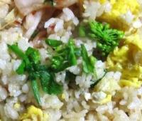 ミズナのつぼみをさっと塩ゆでしてチャーハンにトッピング。ナバナやコマツナより細めのつぼみです。蕾には花を咲かせるための養分がぎっしり詰まっていて栄養満点ですよ。