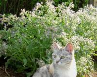 大株に育ったボリジ。次々と花を咲かせています。 我家の猫のキーちゃんと一緒にパチリ・・・