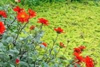 雑草が出てこなくなってグラウンドカバーには最高。手前は車が出入りして踏まれるのでもうここでストップになっている。両側には空いているところにはどんどん進出。柔らかい草なので邪魔なときは簡単に取れる。