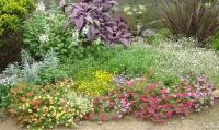 後方左からキンキャラ、サルビア・コクシネア、紫葉のストロビランテス・ディエリアナ、ニューサイラン、中央には宿根カスミソウ、トウテイラン、イソトマ、黄色花のダールベルグデージーなどがあります。