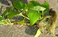 昔からおなじみの雑草ですが、なんとカラスビシャク(烏柄杓)は薬草で球根(球茎)を堀り上げて乾かすと、半夏(はんげ)という漢方薬の原料になるそうです。球根はころころしていて茎がとれた跡がちょうど臍(へそ)のようにくぼんでいるので「へそくり」とよばれているそうです。この球根は漢方薬の原料になるの、で比較的高く取り引きされていて昔の農家の主婦はこれを取りためて薬屋に売ってお小遣いを貯めたそうです。お小遣いを内緒にして貯めていたので、内緒にして貯めるお小遣いを「へそくり」というようになったとか・・・