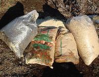 左からもみがら†炭(1/3)、なたね油カス(1袋)、ヌカ(3袋)、もみがら(3袋)