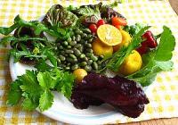 チコリ、ハナユズ、ルッコラ「宿根セルバチカ」、クロマメの早採り、手前はレッドビート、セロリのベビーリーフ、ピーマンの遅採り(赤)