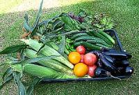 トウモロコシ、金時草、キュウリ、ナス、トマト、シシトウなど
