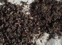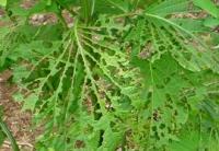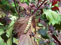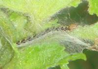 葉を糸で綴り合わせ、中に幼虫が入っていて、はじめ葉肉だけを食害し、葉はだんだん網目状になり、やがて葉全部を食いつくします。取ろうとすると逃げ足は速いです。