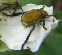 アシナガコガネは白やピンク、黄色、ブルーなどの淡い色の花などが好きなので、それらに真っ先にめがけてやってきます。畑にいるときに麦わら帽子や白っぽい服をきていたら大変! わ†っと集団で向かってきます。