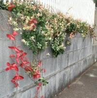 近所の家と車庫の間のフェンスにあるハツユキカズラ・・