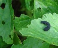 我が家ではアブラナ科によく見かけるカブラハバチ(セグロカブラハバチ)が一番多くいて、触るとすぐにころりと丸まり落ちてしまいます。そのままにしていると大発生のときは丸裸になってしまいます。さほど被害がないときもありますが、やっぱり防虫ネットや不織布で覆ったほうがいいと思います。