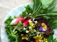 エディブルフラワーのパンジーやビオラ、ルッコラの花、リーフレタスと紅白ハツカダイコン