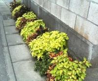 西日の当る狭い道路沿いの塀のコリウス。ここは幅6cmぐらいしかないのですよ。