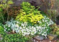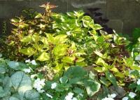 白い花はインパーチェンス、白っぽい葉はブルンネラ・ジャックフロスト、ツボサンゴ(ヒューケラ)などがあります。