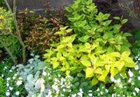 後ろ中央の幅広い葉は紫ウコンで、右の幅広い葉はニューサイラン。グランドカバーになっているのはアカプルコゴールドです。