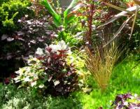 手前の左側がコリウス「ミッドナイトグリーン」、右は細葉で黄金色のスティパ・アランティです。コリウスの左後ろはなんと赤紫蘇なのですよ。