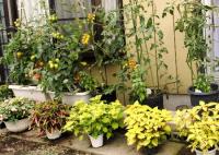 コリウス「ニューゴールド」と小さくて赤いコリウスは多分「ブリリアンシー」、左はルドベキア。