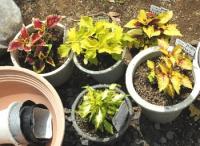 右上の鉢植えの緋赤色の品種コリウスはウィンターサンです。