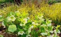 逆光のセキショウとクリスマスローズ・・・ 逆光でセキショウがなおさらピカピカ光る!