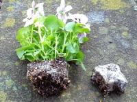 詰まりしているパンジー・ビオラの苗は上の方法で根を処理してから鉢に植えつけます。