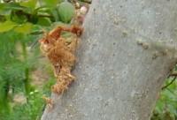 ふ化した幼虫が木の中に入って内部を食い、おがくずの粉のようなふんを穴の外に出します。