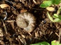 この虫はネキリムシといっていますが、根を切っているわけではなく、若い植物の茎や葉の付け根を食いちぎってしまう困った虫です。よく野菜や花の苗が被害にあいます。