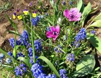 昔からのこぼれ種の3色スミレやムスカリ、チューリプの花後の姿