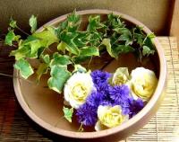水盤に水を入れて、バラ(名前不明)、アイビー、ヤグルマギクが入っています。