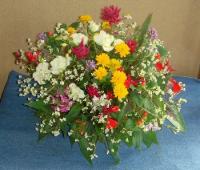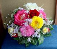野草のエノコログサ、ニラの花(小さな白花)、シュウメイギク(大きな白花)、自宅栽培のバラ(赤、ピンク、オレンジ)、頂いたランや葉も入っています。