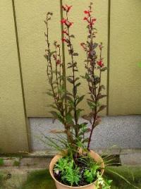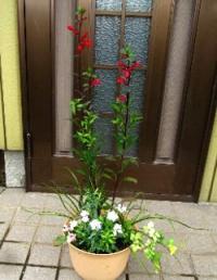 前年にさし芽した宿根ロベリアの苗を使い、寄せ植えにしました。でも丈が高くバランスが悪いですね。