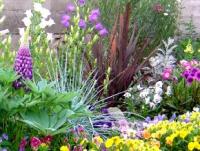 初夏の花壇は華やかです。ヤグルマギク、カンパニュラ、ジキタリス、ルピナス(ノボリフジ)、パンジー・ビオラ、キンギョソウなどがあります。
